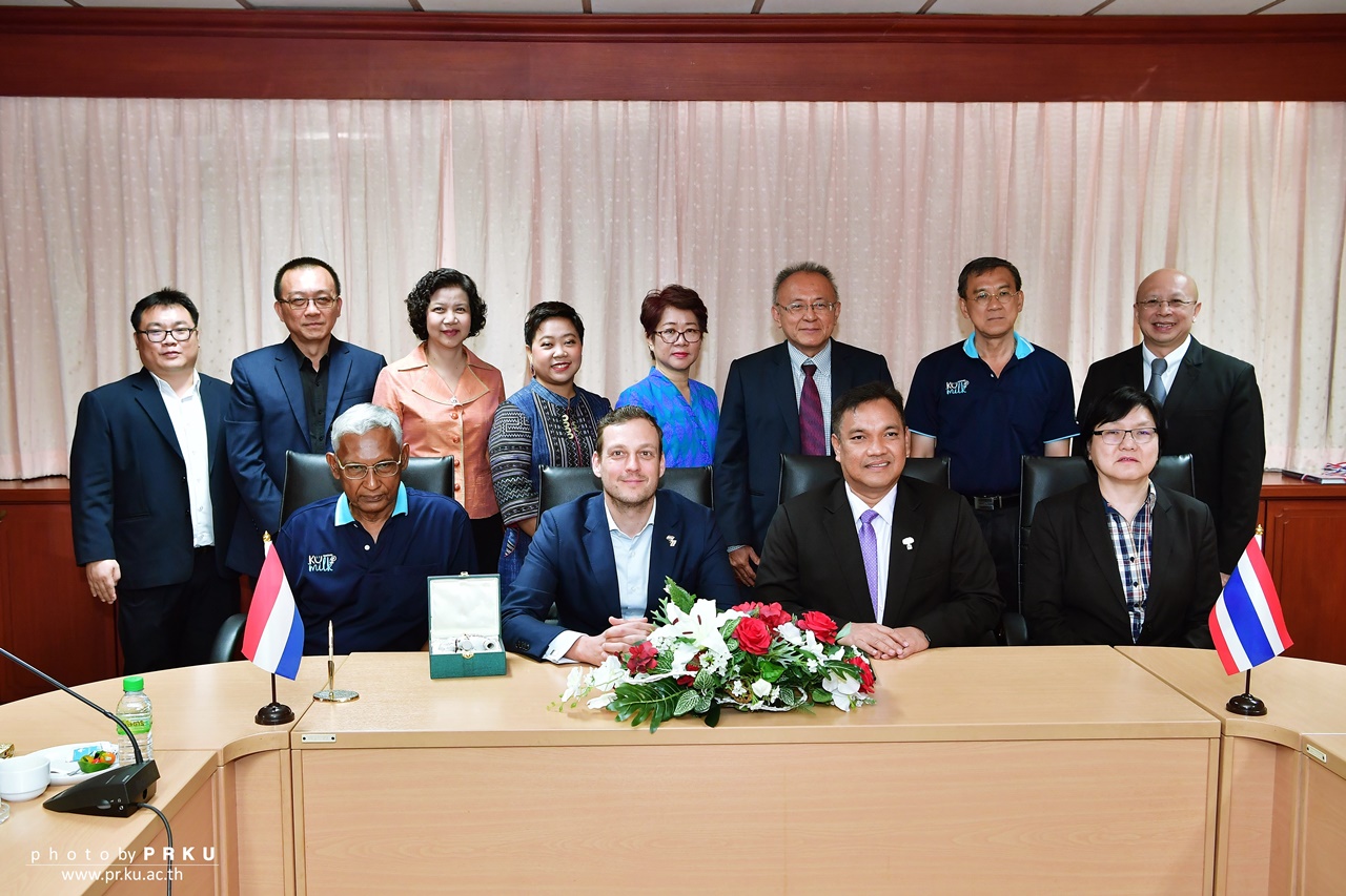 ดร.จงรัก วัชรินทร์รัตน์ รักษาการแทนอธิการบดีมหาวิทยาลัยเกษตรศาสตร์ ให้การต้อนรับ Mr.Willem Shoustra ,Dutch Agricultural Counsellor , the Embassy of the Kingdom of the Netherlands ซึ่งเดินทางมาเยือนมหาวิทยาลัยเกษตรศาสตร์เพื่อแนะนำตัวเนื่องในโอกาสที่เข้ามารับตำแหน่งใหม่ และเยี่ยมชมการดำเนินงานของมหาวิทยาลัย เมื่อวันที่ 7 กุมภาพันธ์ 2562 ณ ห้องประชุม 9 อาคารสารนิเทศ 50 ปี มหาวิทยาลัยเกษตรศาสตร์ บางเขน |