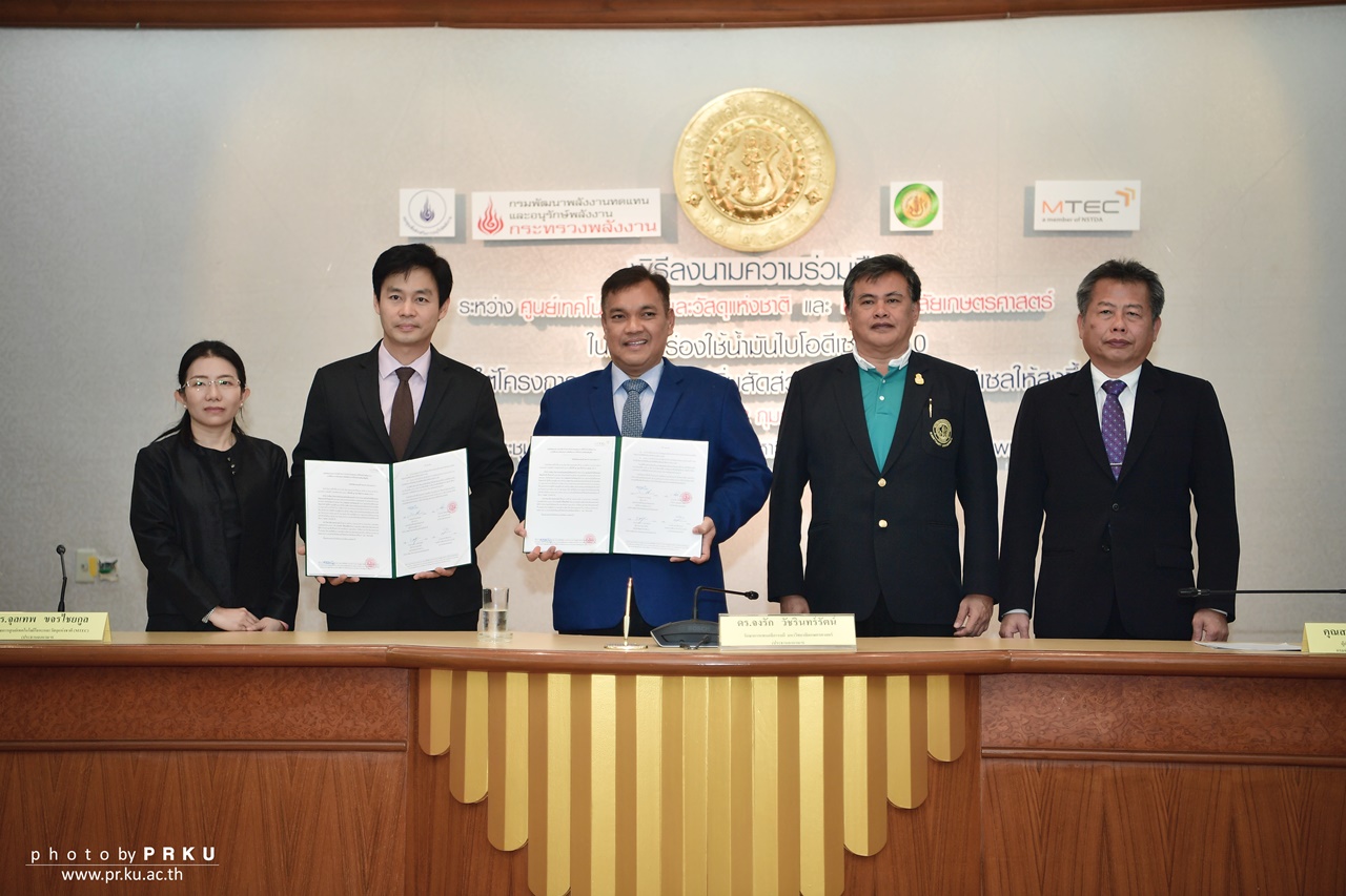 ดร.จงรัก วัชรินทร์รัตน์ รักษาการแทนอธิการบดีมหาวิทยาลัยเกษตรศาสตร์ ร่วมลงนามกับ ดร.จุลเทพ ขจรไชยกูล ผู้อำนวยการศูนย์เทคโนโลยีโลหะและวัสดุแห่งชาติ ปฏิบัติการแทนผู้อำนวยการสำนักงานพัฒนาวิทยาศาสตร์และเทคโนโลยีแห่งชาติ ในบันทึกความร่วมมือ โครงการนำร่องร่วมทดสอบการใช้น้ำมันไบโอดีเซล B 10 ระหว่าง มหาวิทยาลัยเกษตรศาสตร์ กับ ศูนย์เทคโนโลยีโลหะและวัสดุแห่งชาติ (MTEC) สำนักงานพัฒนาวิทยาศาสตร์และเทคโนโลยีแห่งชาติ (สวทช.) ซึ่งโครงการนี้ได้รับการสนับสนุนงบประมาณจากกองทุนเพื่อส่งเสริมการอนุรักษ์พลังงาน ประจำปี 2560 กรมพัฒนาพลังงานทดแทนและอนุรักษ์พลังงาน (พพ.) โดยมี ดร.ดำรงค์ ศรีพระราม รองอธิการบดีฝ่ายบริหารกิจการภายใน มหาวิทยาลัยเกษตรศาสตร์ และ ดร.สุมิตรา จรสโรจน์กุล ผู้อำนวยการหน่วยวิจัยวัสดุสำหรับพลังงาน ศูนย์เทคโนโลยีโลหะและวัสดุแห่งชาติ ร่วมลงนามเป็นพยาน โอกาสนี้ นายสมชาย สถากุลเจริญ ผู้อำนวยการสำนักพัฒนาเชื้อเพลิงชีวภาพ กรมพัฒนาพลังงานทดแทนและอนุรักษ์พลังงาน ให้เกียรติร่วมแสดงความยินดีด้วย เมื่อวันที่ 12 กุมภาพันธ์ 2562 ณ ห้องประชุมกำพล อดุลวิทย์ อาคารสารนิเทศ 50 ปี มหาวิทยาลัยเกษตรศาสตร์ บางเขน