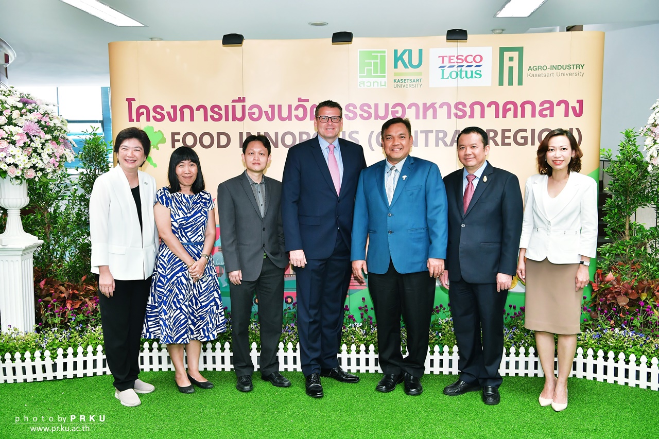 ดร.จงรัก วัชรินทร์รัตน์ รักษาการแทนอธิการบดีมหาวิทยาลัยเกษตรศาสตร์ เป็นประธานในการแถลงความร่วมมือไตรภาคี ในการพัฒนานวัตกรรมวิจัยด้านเกษตรและอาหาร ภายใต้โครงการเมืองนวัตกรรมอาหาร ภาคกลาง ระหว่างมหาวิทยาลัยเกษตรศาสตร์ กับสำนักงานคณะกรรมการนโยบายวิทยาศาสตร์เทคโนโลยีและนวัตกรรมแห่งชาติ (สวทน.) และบริษัทเอก-ชัย ดีสทริบิวชั่น ซิสเทม จำกัด (Tesco Lotus) เพื่อพัฒนาสินค้าเกษตรและอาหารด้วยระบบวิทยาศาสตร์ เทคโนโลยีและนวัตกรรมขั้นสูงให้ได้เป็นอาหารเชิงสุขภาพ มีรสชาติดี โดยผลสำเร็จระยะแรกของโครงการในปีงบประมาณ 2561 สามารถพัฒนาชุดอาหารสุขภาพ ประกอบด้วยอาหารคาว 9 ชนิด อาหารหวาน 2 ชนิด อาหารขบเคี้ยว 2 ชนิด เครื่องดื่ม 1 ชนิด รวมเป็น 14 ชนิด และยังได้ผลิตภัณฑ์เครื่องปรุงรสและส่วนผสมอาหารอีก 2 ชนิด เมื่อวันที่ 20 กุมภาพันธ์ 2562 ณ ห้องประชุมกำพล อดุลวิทย์ อาคารสารนิเทศ 50 ปี มหาวิทยาลัยเกษตรศาสตร์ บางเขน |