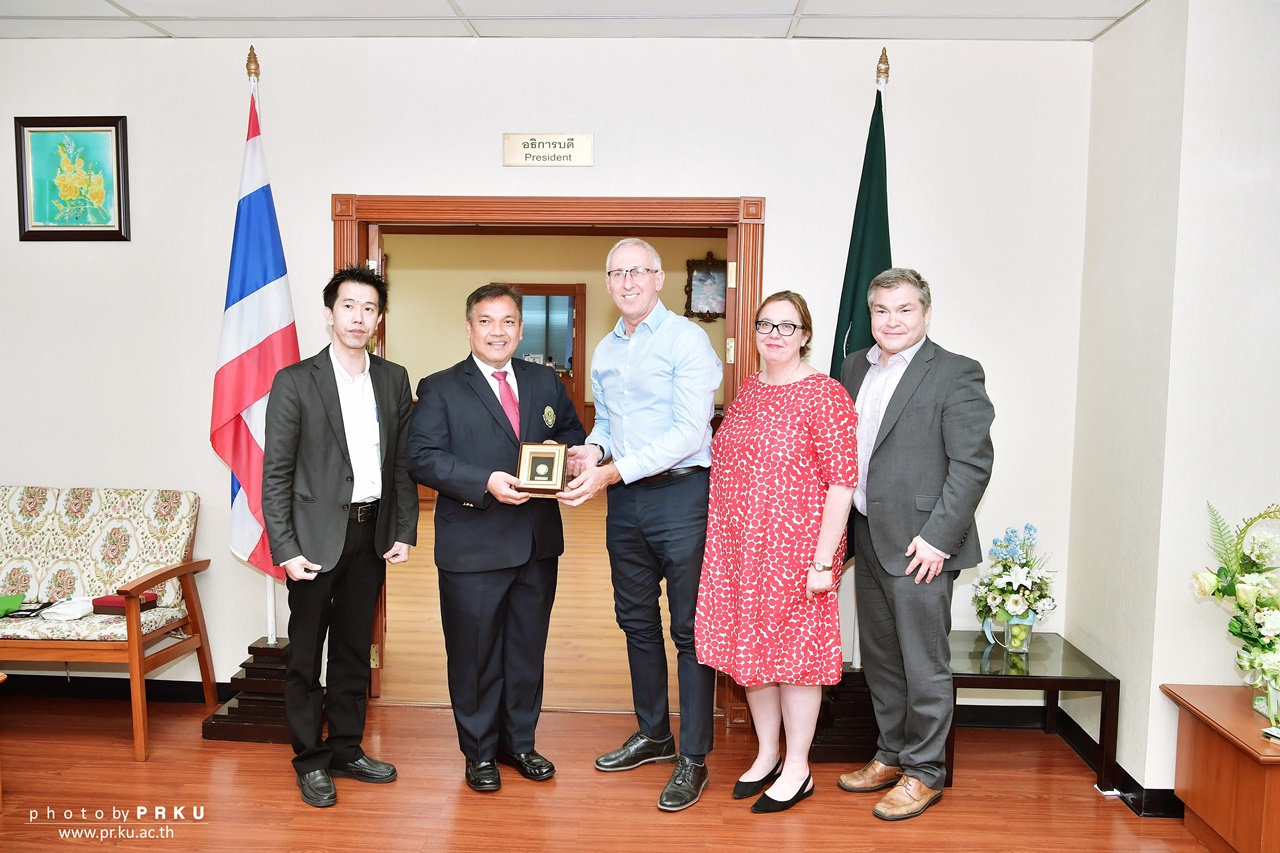 ดร.จงรัก วัชรินทร์รัตน์ รักษาการแทนอธิการบดีมหาวิทยาลัยเกษตรศาสตร์ ให้การต้อนรับ Professor Kevin Hall, the Deputy Vice chancellor จาก Newcastle University ประเทศออสเตรเลีย พร้อมคณะ ซึ่งเดินทางมาเยือนมหาวิทยาลัยเกษตรศาสตร์ เพื่อหารือถึงแนวทางในความร่วมมือทางวิชาการระหว่างสองสถาบัน เมื่อวันที่ 5 มีนาคม 2562 ณ ห้องอธิการบดี อาคารสารนิเทศ 50 ปี มหาวิทยาลัยเกษตรศาสตร์ บางเขน |
