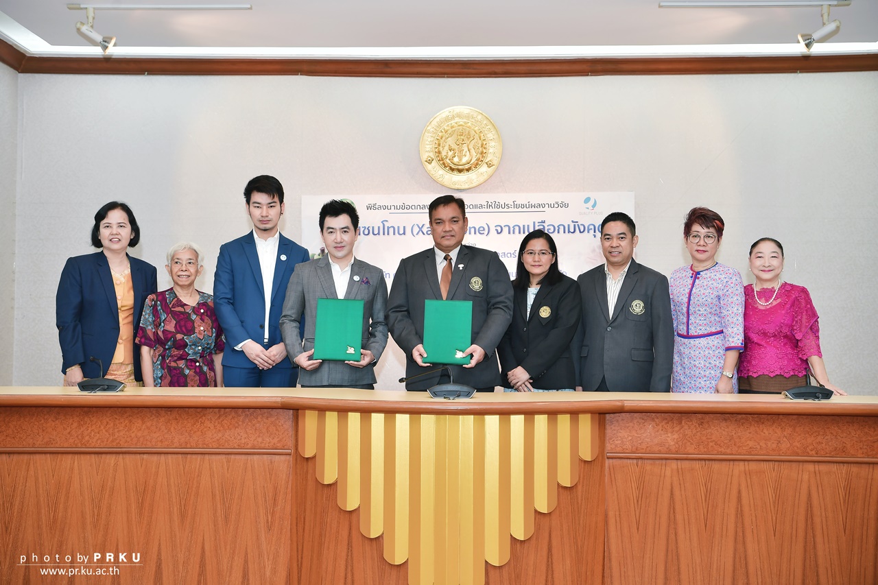 ดร.จงรัก วัชรินทร์รัตน์ รักษาการแทนอธิการบดีมหาวิทยาลัยเกษตรศาสตร์ ร่วมลงนามกับ นายอัษฎา เทพยศ ประธานบริษัท ควอลิตี้ พลัส เอสเทติค อินเตอร์เนชั่นแนล จำกัด ในบันทึกข้อตกลงอนุญาตให้ใช้ประโยชน์ผลงานวิจัย “สารแซนโทน (Xanthone) จากเปลือกมังคุด” ซึ่งเป็นผลงานของ ดร.อุดมลักษณ์ สุขอัตตะ นักวิจัยชำนาญการ และทีมงาน ภายใต้รูปแบบการอนุญาตให้ใช้สิทธิ “ถือครองแต่เพียงผู้เดียว (Exclusive Licensing)” เป็นเวลา 5 ปี โดยบริษัทสามารถนำผลงานวิจัยไปพัฒนาต่อยอดเป็นผลิตภัณฑ์ใหม่เพื่อจำหน่ายเชิงพาณิชย์ สร้างความมั่นใจให้กับผู้ประกอบการในการผลิตและจำหน่ายผลิตภัณฑ์มากยิ่งขึ้น โดยมี ผศ.ดร.กัมปนาท เพ็ญสุภา รองอธิการบดีฝ่ายบริการวิชาการ เป็นผู้กล่าวรายงานและร่วมเป็นสักขีพยานในพิธี เมื่อวันที่ 3 เมษายน 2562 ณ ห้องประชุมกำพล อดุลวิทย์ อาคารสารนิเทศ 50 ปี มหาวิทยาลัยเกษตรศาสตร์ บางเขน