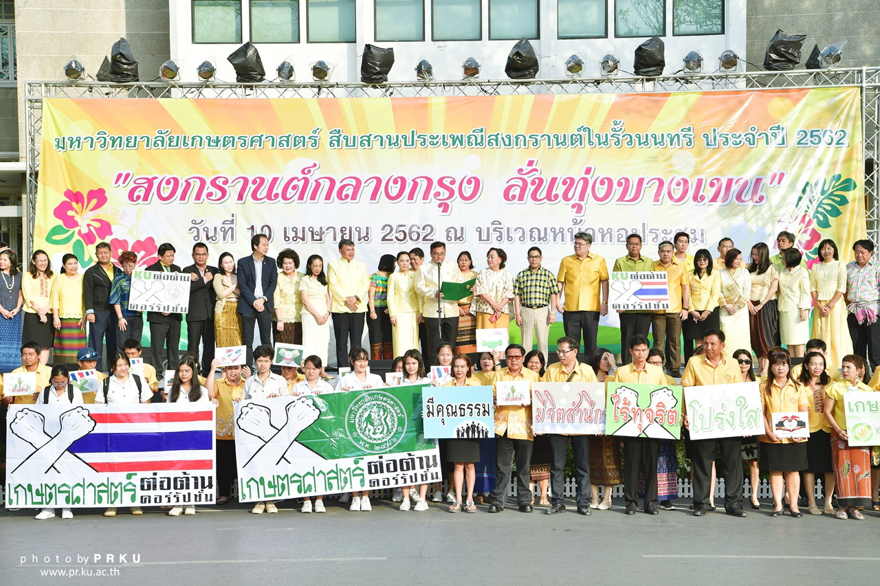 ผู้บริหาร บุคลากร และนิสิตของมหาวิทยาลัยเกษตรศาสตร์ ร่วมในพิธีประกาศเจตจำนง เรื่อง นโยบายคุณธรรมและความโปร่งใส ในการดำเนินงานของมหาวิทยาลัยเกษตรศาสตร์ ประจำปีงบประมาณ 2562 เพื่อเป็นการเน้นย้ำให้บุคลากรทุกส่วนงานได้รับทราบการดำเนินงานของมหาวิทยาลัย ตามแนวทางการประเมินคุณธรรมและความโปร่งใสในการดำเนินงานของหน่วยงานภาครัฐ ซึ่งในปีงบประมาณ 2561 มหาวิทยาลัยเกษตรศาสตร์ ได้คะแนนร้อยละ 89.49 ซึ่งถือว่ามีคุณธรรมและความโปร่งใสในการดำเนินงานระดับสูงมาก โดยเป็นลำดับที่ 7 ของกลุ่มสถาบันอุดมศึกษาจำนวน 81 หน่วยงาน เมื่อวันที่ 10 เมษายน 2562 ณ หอประชุมใหญ่ มหาวิทยาลัยเกษตรศาสตร์ บางเขน