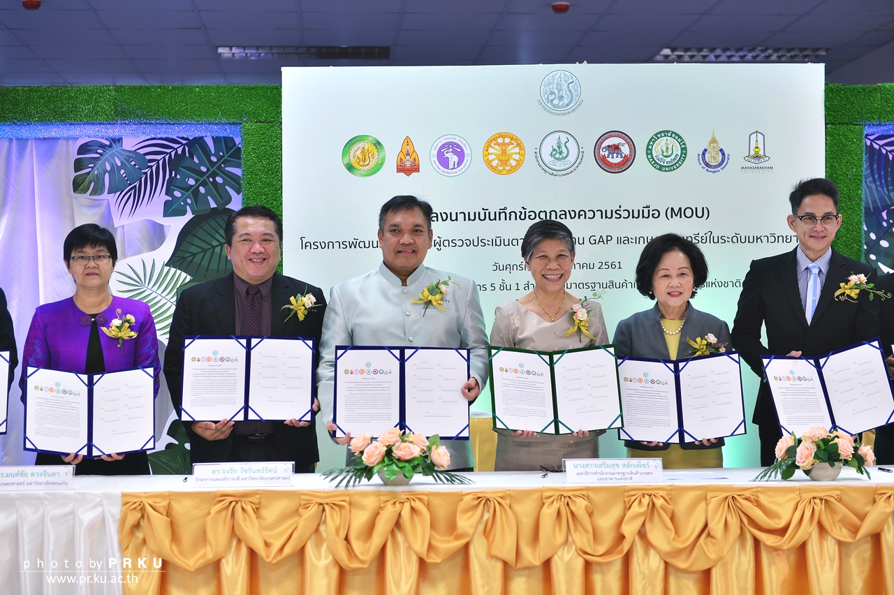 ดร.จงรัก วัชรินทร์รัตน์ รักษาการแทนอธิการบดีมหาวิทยาลัยเกษตรศาสตร์ ร่วมลงนามกับ นางสาวเสริมสุข สลักเพ็ชร์ เลขาธิการ มกอช. ในบันทึกข้อตกลงความร่วมมือการพัฒนาหลักสูตรผู้ตรวจประเมินตามมาตรฐาน GAP และเกษตรอินทรีย์ ในระดับมหาวิทยาลัย ระหว่าง สำนักงานมาตรฐานสินค้าเกษตรและอาหารแห่งชาติ (มกอช.) กับมหาวิทยาลัยเกษตรศาสตร์ โดย มกอช.จะกำหนดแผนการพัฒนาหลักสูตรสำหรับผู้ตรวจประเมินและที่ปรึกษาเกษตรกรตามการปฏิบัติทางการเกษตรที่ดี (Good Agriculture Practices : GAP) และมาตรฐานเกษตรอินทรีย์ ด้านพืช ประมง ปศุสัตว์ ให้แก่นิสิต เพื่อให้มีบุคลากรด้านการตรวจประเมินสินค้าเกษตรและอาหารอย่างต่อเนื่อง สอดรับกับนโยบายการถ่ายโอนภารกิจด้านการตรวจสอบรับรองของกระทรวงเกษตรและสหกรณ์ไปสู่ภาคเอกชน เมื่อวันที่ 25 พฤษภาคม 2561 ณ ห้องประชุม 511 อาคาร 5 สำนักงานมาตรฐานสินค้าเกษตรและอาหารแห่งชาติ กรุงเทพฯ