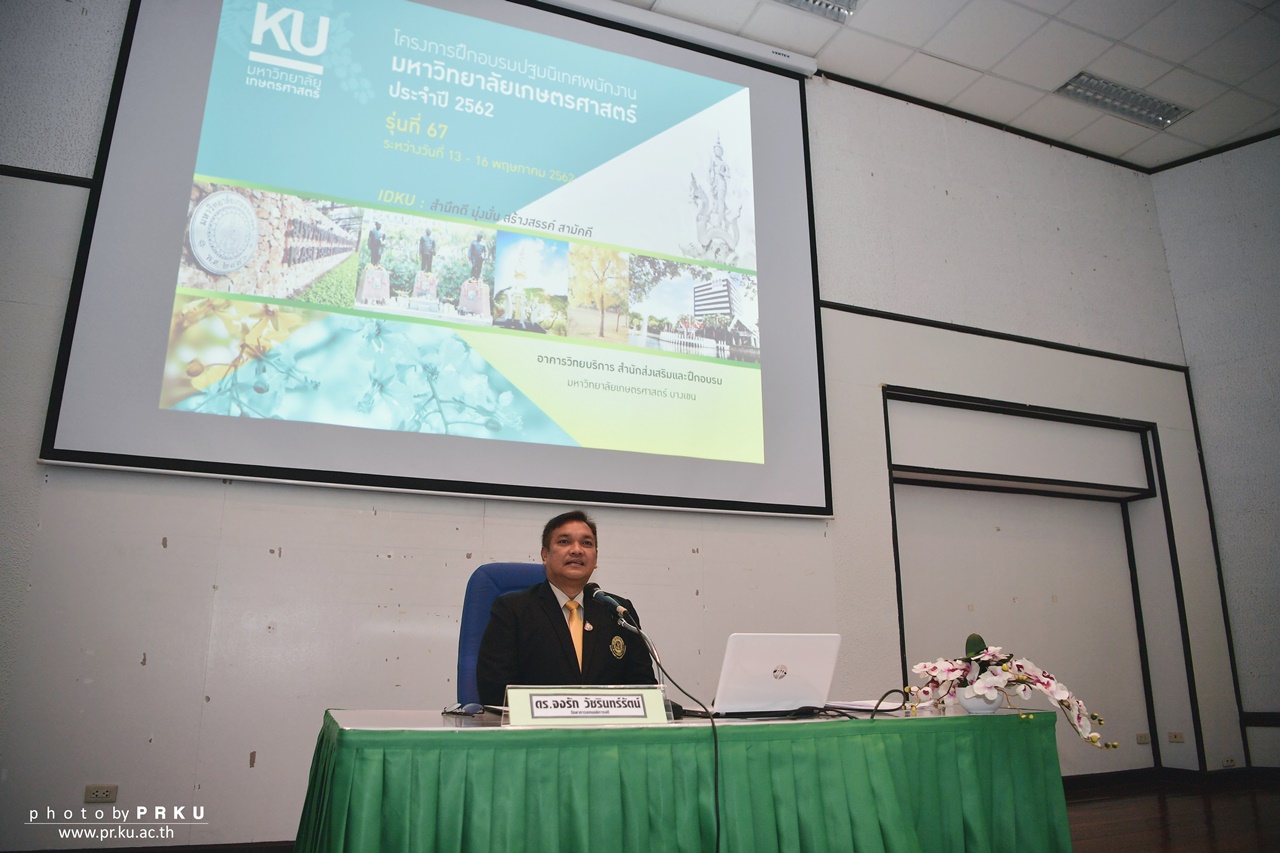 ดร.จงรัก วัชรินทร์รัตน์ รักษาการแทนอธิการบดีมหาวิทยาลัยเกษตรศาสตร์ เป็นประธานเปิดโครงการฝึกอบรมปฐมนิเทศพนักงานมหาวิทยาลัยเกษตรศาสตร์ ประจำปี 2562 รุ่นที่ 67 และบรรยายพิเศษ หัวข้อ การบริหารจัดการในรั้วนนทรี เมื่อวันที่ 13 พฤษภาคม 2562 ณ ห้องประชุมวัฒนา สวรรยาธิปัติ อาคารวิทยบริการ สำนักส่งเสริมและฝึกอบรม มหาวิทยาลัยเกษตรศาสตร์ บางเขน