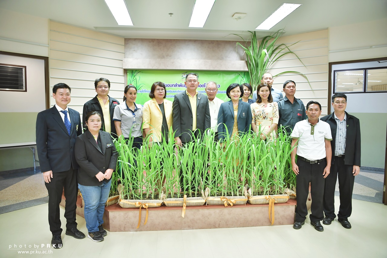 ผศ.ดร.สุตเขตต์ นาคะเสถียร คณบดีคณะเกษตร มหาวิทยาลัยเกษตรศาสตร์ ร่วมกับ ผศ.สุภาวดี โพธิยะราช ผอ.ฝ่ายการวิจัยมุ่งเป้า สำนักงานกองทุนสนับสนุนการวิจัย (สกว.) ทำพิธีมอบกล้าพันธุ์อ้อยปลอดโรคใบขาว ซึ่งเป็นผลงานวิจัยของ รศ.สุภาพร กลิ่นคง จากภาควิชาโรคพืช คณะเกษตรกำแพงแสน มหาวิทยาลัยเกษตรศาสตร์ ภายใต้โครงการการจัดทำแปลงพันธุ์หลักอ้อยปลอดโรคใบขาว (ต่อเนื่อง) จำนวน100,000 ต้น เพื่อมอบให้เกษตรกรนำไปปลูกทดแทนอ้อยเป็นโรคและลดพื้นที่การระบาดของโรคใบขาว เมื่อวันที่ 16 พฤษภาคม 2562 ณ อาคารวชิรานุสรณ์ คณะเกษตร มหาวิทยาลัยเกษตรศาสตร์ บางเขน