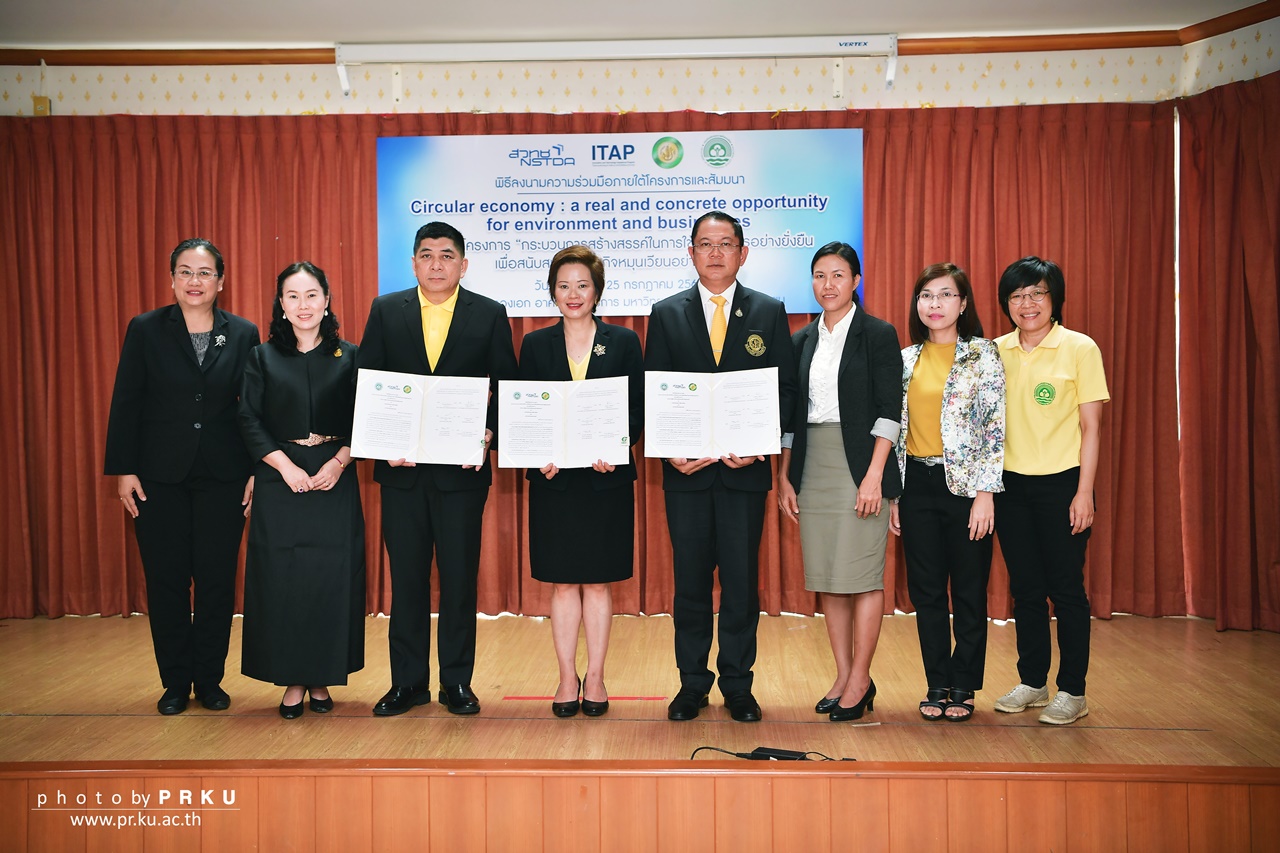 รศ.ดร.สุดเขตต์ นาคะเสถียร คณบดีคณะเกษตร ร่วมลงนามกับ นายรัชฎา สุริยกุล ณ อยุธยา อธิบดีกรมส่งเสริมคุณภาพสิ่งแวดล้อม และ นางฐิตาภา สมิตินนท์ ผู้อำนวยการศูนย์บริการจัดการเทคโนโลยี สำนักงานพัฒนาวิทยาศาสตร์และเทคโนโลยีแห่งชาติ (สวทช.) ในบันทึกความร่วมมือทางวิชาการระหว่างหน่วยงาน ภายใต้โครงการ “กระบวนการสร้างสรรค์ในการใช้ทรัพยากรอย่างยั่งยืน เพื่อสนับสนุนเศรษฐกิจหมุนเวียนอย่างแท้จริง” เมื่อวันที่ 25 กรกฎาคม 2562 2562 ณ ห้องทองเอก อาคารวิทยบริการ มหาวิทยาลัยเกษตรศาสตร์ บางเขน