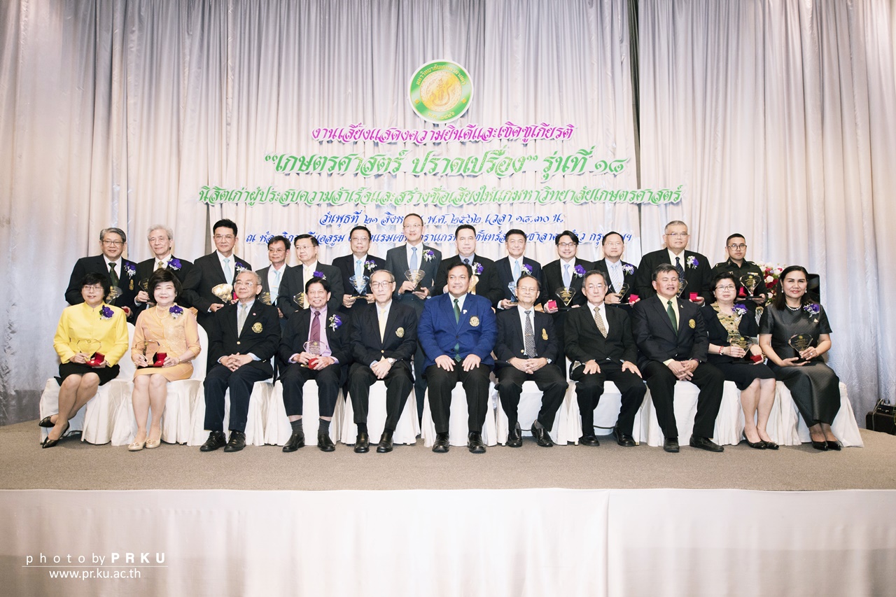 มหาวิทยาลัยเกษตรศาสตร์จัดงาน “เกษตรศาสตร์ ปราดเปรื่อง” รุ่นที่ 18 เพื่อเป็นการยกย่องนิสิตเก่าของมหาวิทยาลัยที่ประสบความสำเร็จ มีความก้าวหน้าในชีวิตและหน้าที่การงาน โดยมี ดร.กฤษณพงศ์ กีรติกร นายกสภามหาวิทยาลัยเกษตรศาสตร์ เป็นผู้มอบเข็มพระพิรุณทองคำ และ ดร.จงรัก วัชรินทร์รัตน์ รักษาการแทนอธิการบดีมหาวิทยาลัยเกษตรศาสตร์ เป็นผู้มอบโล่เชิดชูเกียรติ เมื่อวันที่ 21 สิงหาคม 2562 ณ ห้องวิภาวดีบอลรูม C โรงแรมเซ็นทารา แกรนด์ เซ็นทรัลพลาซ่า ลาดพร้าว กรุงเทพฯ