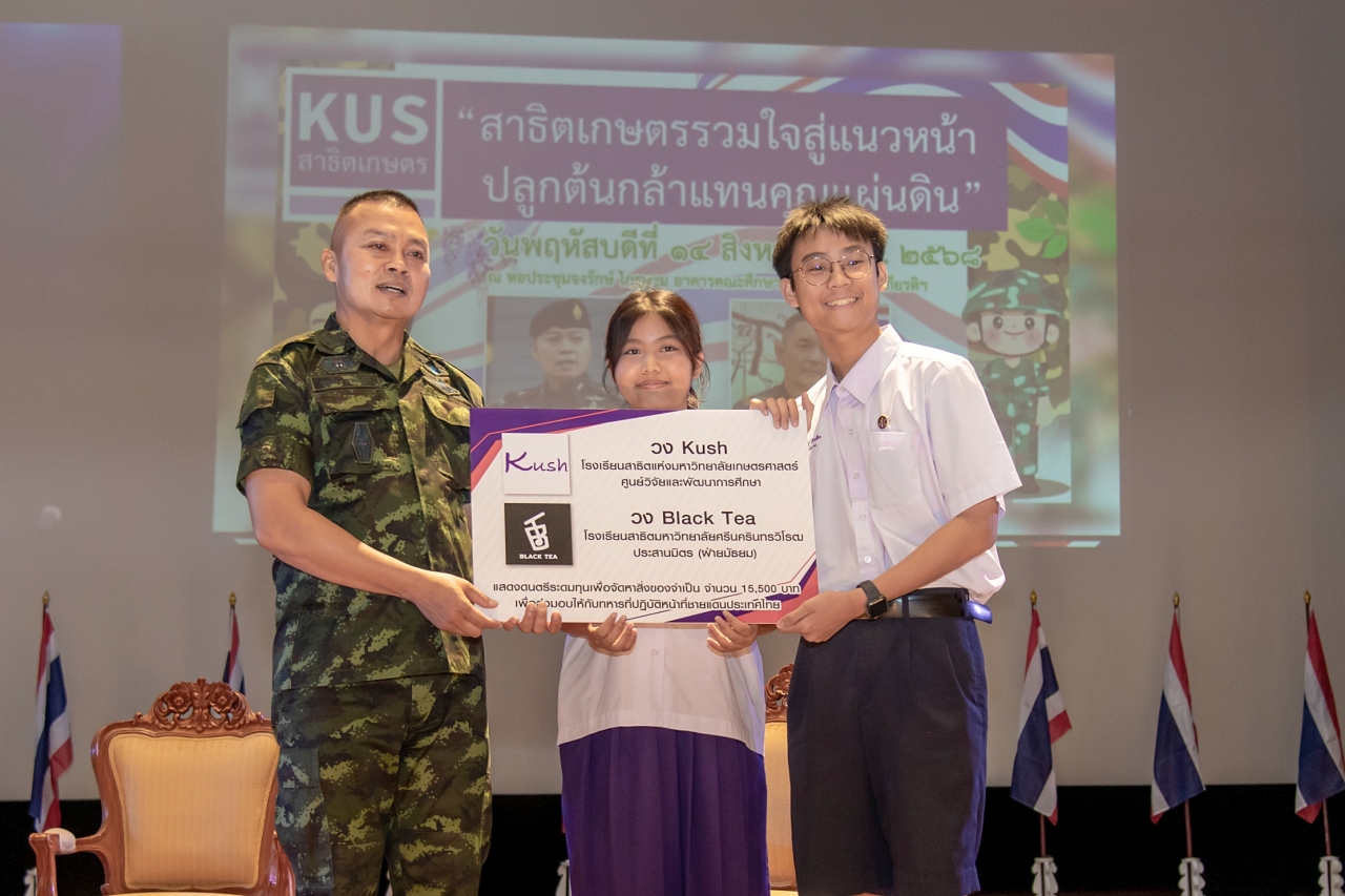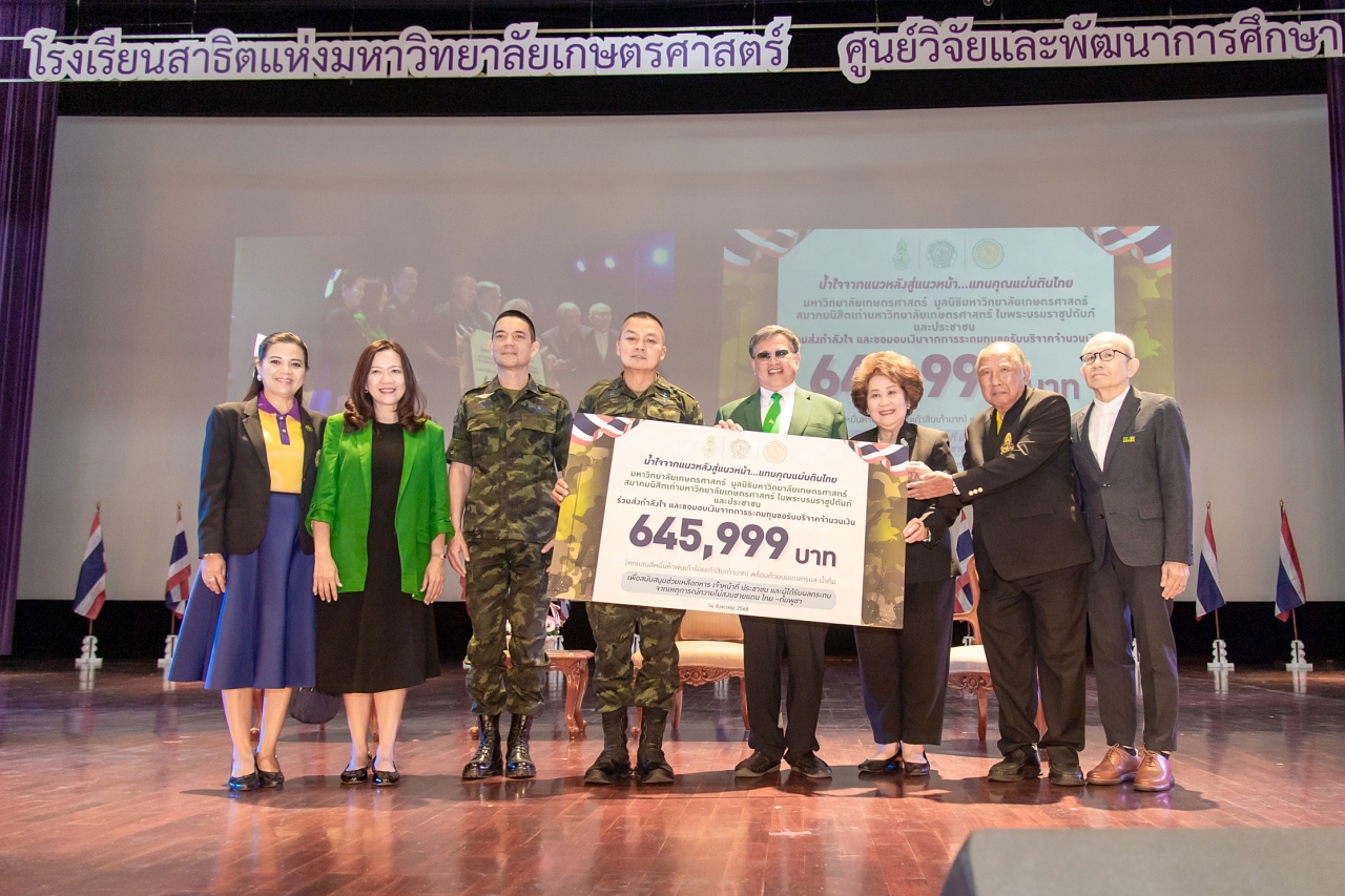 โอกาสนี้ ดร.ดำรงค์ ศรีพระราม รักษาการแทนอธิการบดีมหาวิทยาลัยเกษตรศาสตร์ ในนามของประชาชน บุคลากร นิสิตปัจจุบัน นิสิตเก่า ผู้บริจาคผ่านการระดมทุนของมหาวิทยาลัยเกษตรศาสตร์ มูลนิธิมหาวิทยาลัยเกษตรศาสตร์ และ สมาคมนิสิตเก่ามหาวิทยาลัยเกษตรศาสตร์ในพระบรมราชูปถัมภ์ ขอมอบเงินจากการระดมทุนจำนวน 645,999 บาท เพื่อสนับสนุนช่วยเหลือทหาร เจ้าหน้าที่ ประชาชน และผู้ได้รับผลกระทบจากเหตุการณ์ความไม่สงบชายแดน ไทย -กัมพูชา นำไปจัดซื้อสิ่งของจำเป็น รวมถึงเครื่องบริโภค อุปโภค ยา และเวชภัณฑ์สำหรับการรักษาพยาบาล เครื่องมืออุปกรณ์ทางการแพทย์ ต่อไป