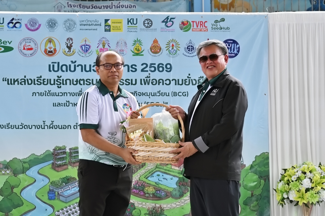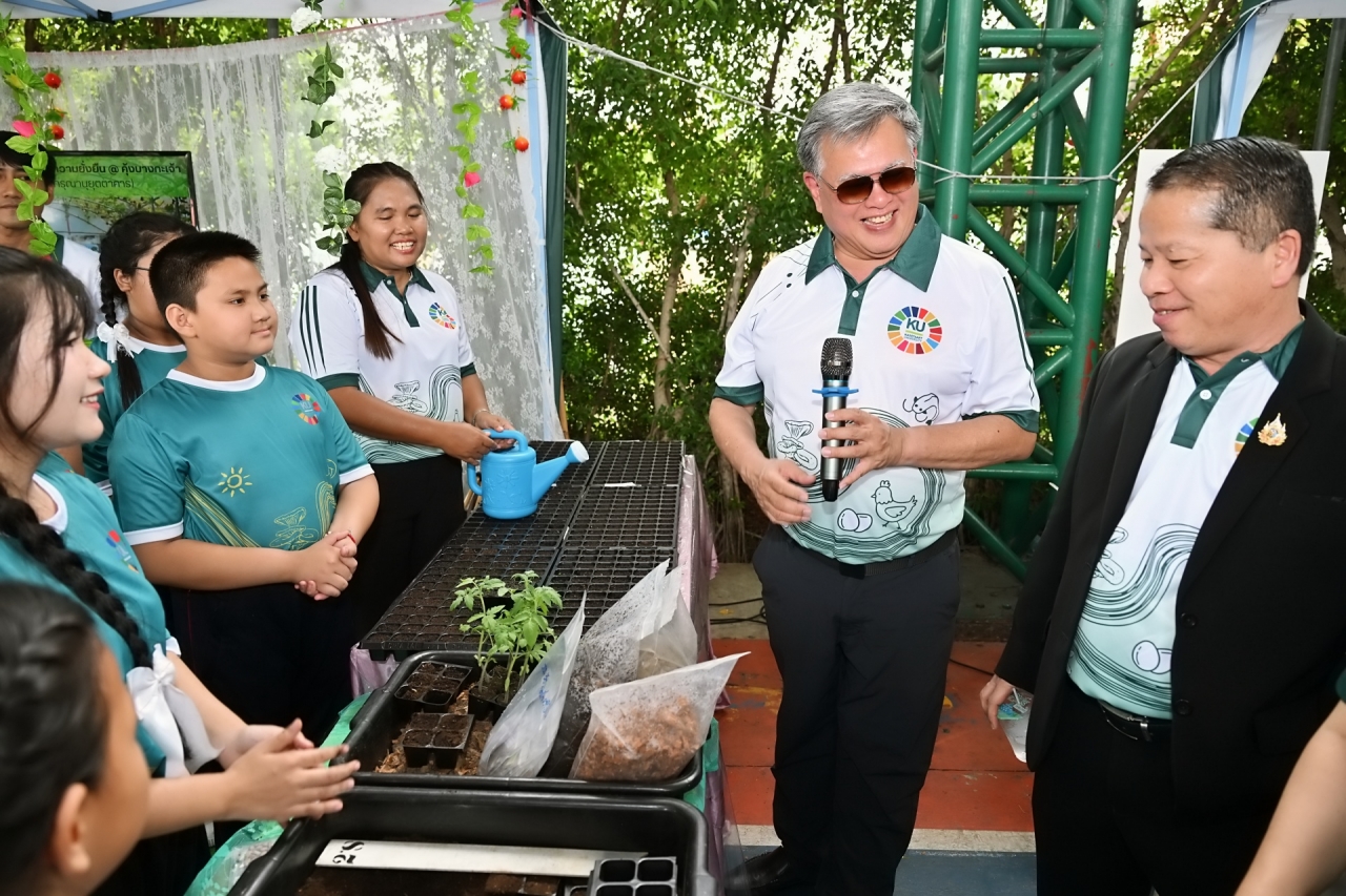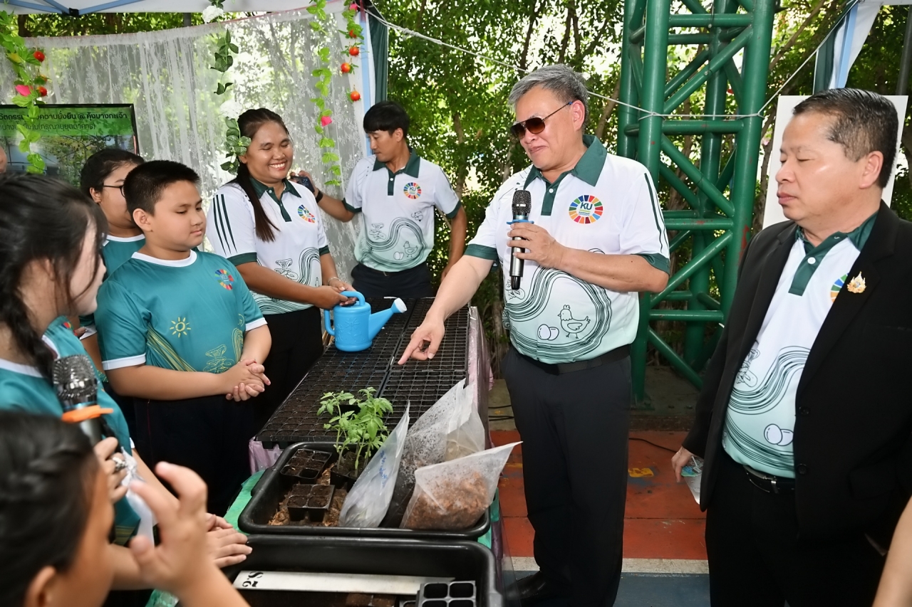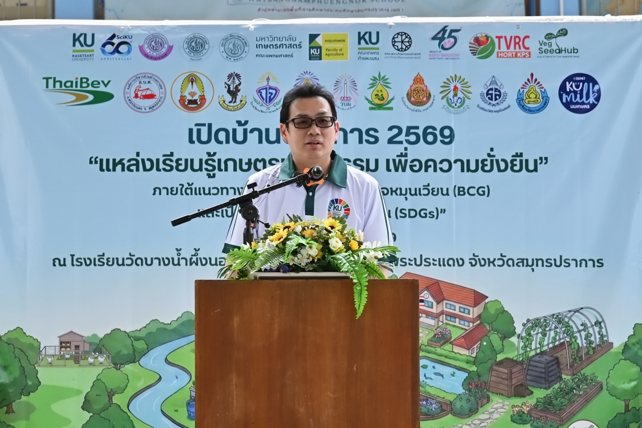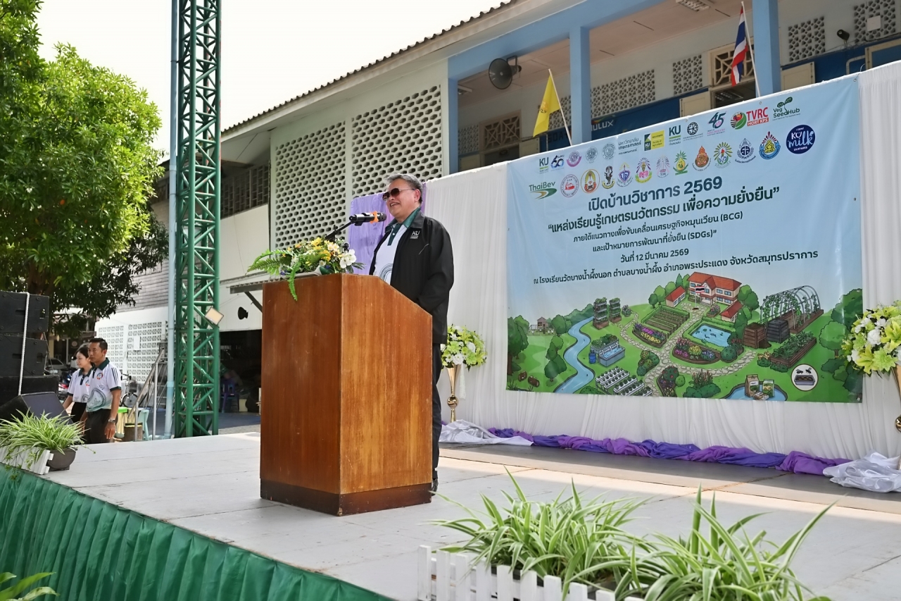 ดร.ดำรงค์ ศรีพระราม รักษาการแทนอธิการบดี มหาวิทยาลัยเกษตรศาสตร์ เป็นประธานเปิดบ้านวิชาการ 2569 แหล่งเรียนรู้เกษตรนวัตกรรมเพื่อความยั่งยืน โครงการบูรณาการกลุ่มโรงเรียนและชุมชนคุ้งบางกะเจ้าเพื่อขับเคลื่อนเศรษฐกิจหมุนเวียน (BCG) และเป้าหมายการพัฒนาที่ยั่งยืน (SDGs) เมื่อวันที่ 12 มีนาคม 2569 ณ โรงเรียนวัดบางน้ำผึ้งบอก ต.บางน้ำผึ้ง อำเภอพระประแดง จังหวัดสมุทรปราการ เพื่อนำเสนอผลงานการดำเนินงานต่อเนื่องของโครงการการบูรณาการความรู้ระหว่างมหาวิทยาลัย โรงเรียน และชุมชนสร้างต้นแบบการเรียนรู้ที่เป็นรูปธรรมและยั่งยืน
