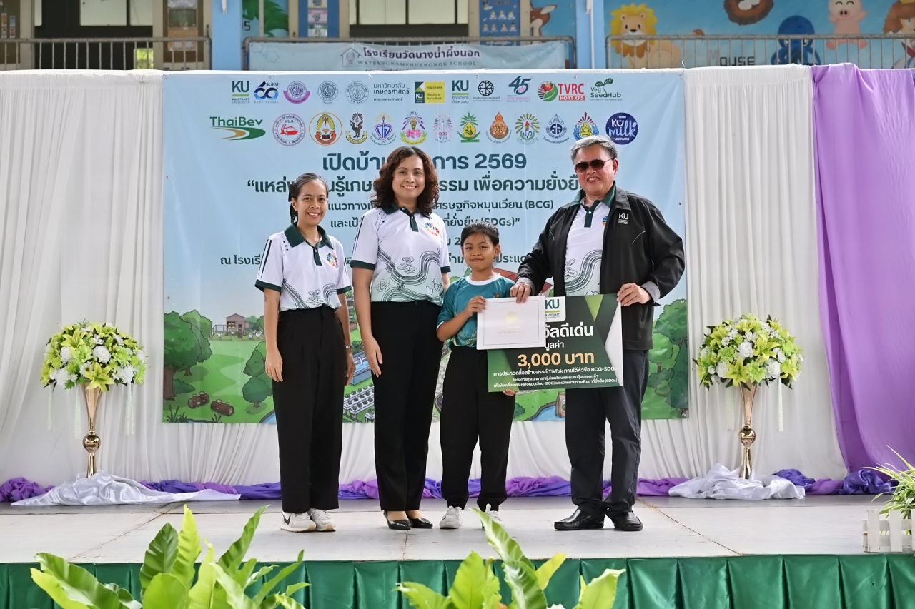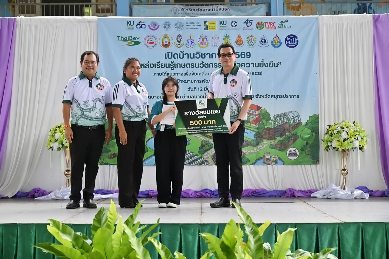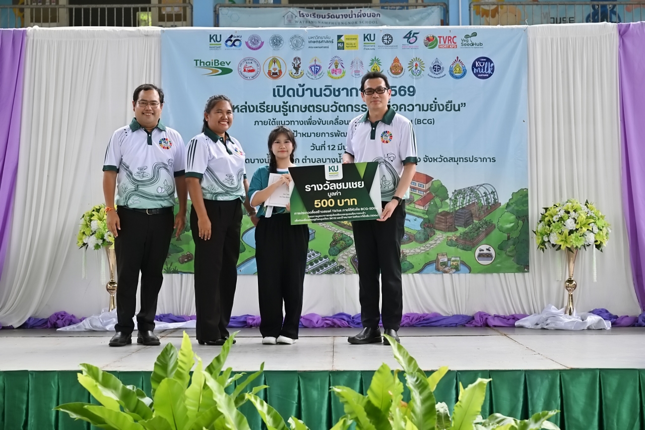 ในโอกาสนี้ ดร.ดำรงค์ ศรีพระราม รักษาการแทนอธิการบดีมหาวิทยาลัยเกษตรศาสตร์ เป็นประธานในพิธีมอบรางวัลการประกวดสื่อสร้างสรรค์ TIkTok ภายใต้หัวข้อ "BCG-SDGs" ดังนี้ รางวัลดีเด่น มูลค่า 3,000 บาท โรงเรียนวัดคันลัด ตำบลทรงคนอง อำเภอพระประแดง จังหวัดสมุทรปราการ รางวัลดี 2,000 บาท โรงเรียนวัดราษฎร์รังสรรค์ ตำบลบางกะเจ้า อำเภอพระประแดง จังหวัดสมุทรปราการ รางวัลชมเชย 500 บาท ได้แก่ โรงเรียนวัดบางน้ำผึ้งนอก ตำบลบางน้ำผึ้ง อำเภอพระประแดง จังหวัดสมุทรปราการ โรงเรียนวัดบางกระสอบ ตำบลบางกระสอบ อำเภอพระประแดง จังหวัดสมุทรปราการ โรงเรียนวัดกองแก้ว ตำบลบางยอ อำเภอพระประแดง จังหวัดสมุทรปราการ โรงเรียนวัดบางน้ำผึ้งใน ตำบลบางน้ำผึ้ง อำเภอพระประแดง จังหวัดสมุทรปราการ โรงเรียนวัดบางกะเจ้ากลาง ตำบลบางยอ อำเภอพระประแดง จังหวัดสมุทรปราการ