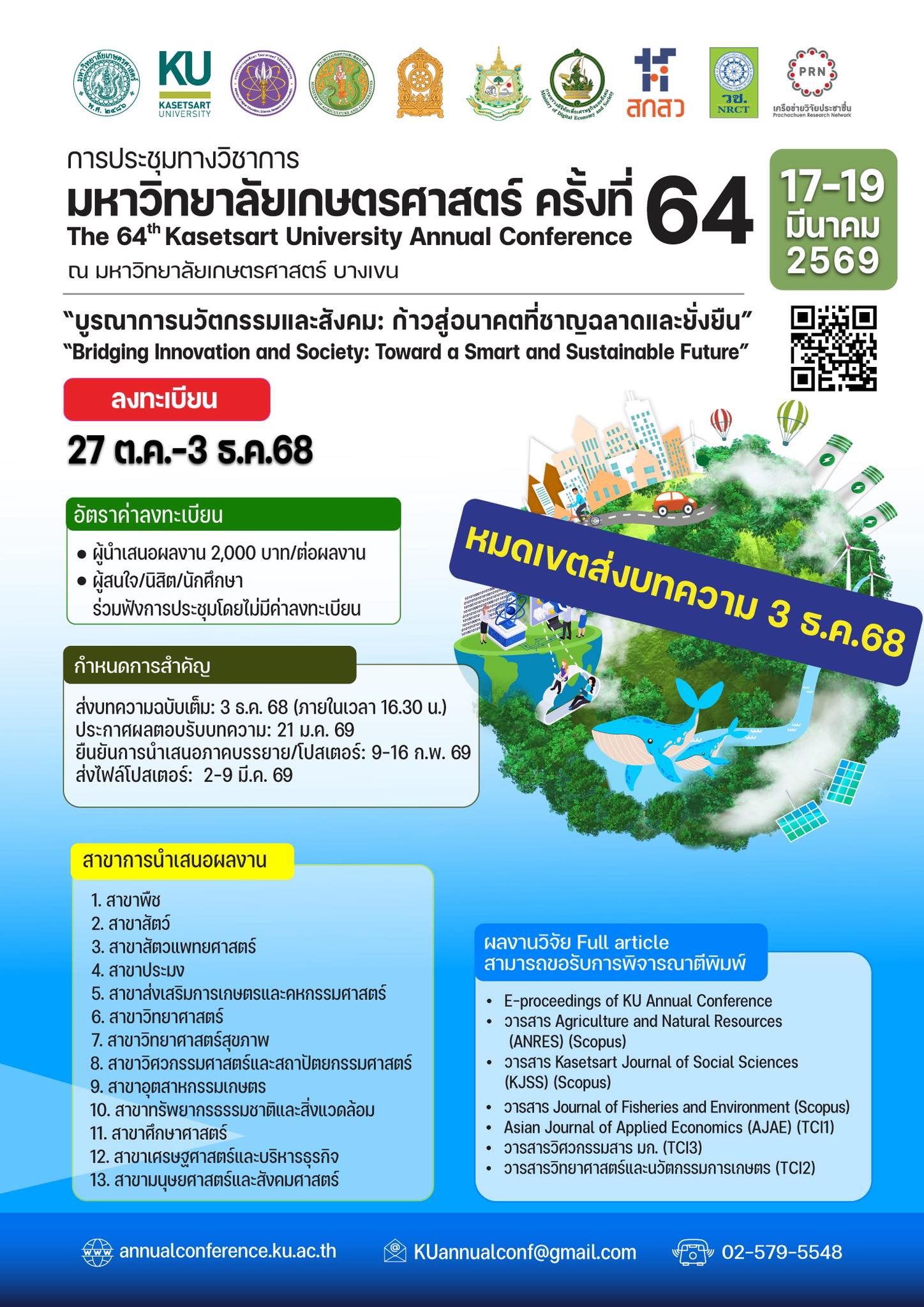 การประชุมทางวิชาการครั้งที่ 64 The 64th Kasetsart University Annual Conference กำหนดจัดขึ้นระหว่างวันที่ 17 - 19 มีนาคม 2569 ณ มหาวิทยาลัยเกษตรศาสตร์ บางเขน ภายใต้หัวข้อ