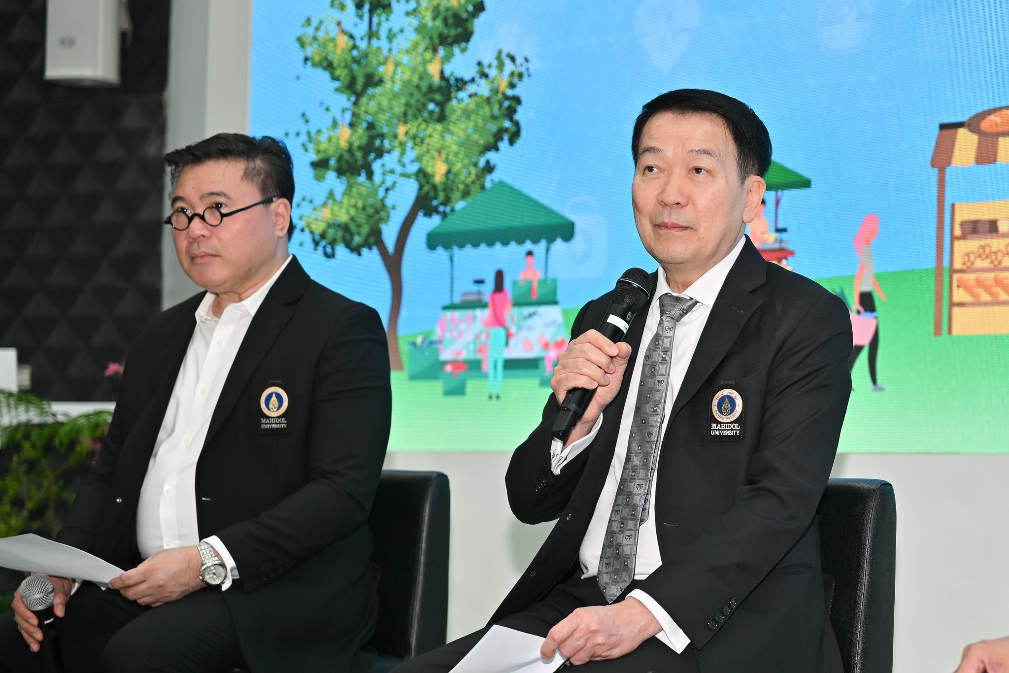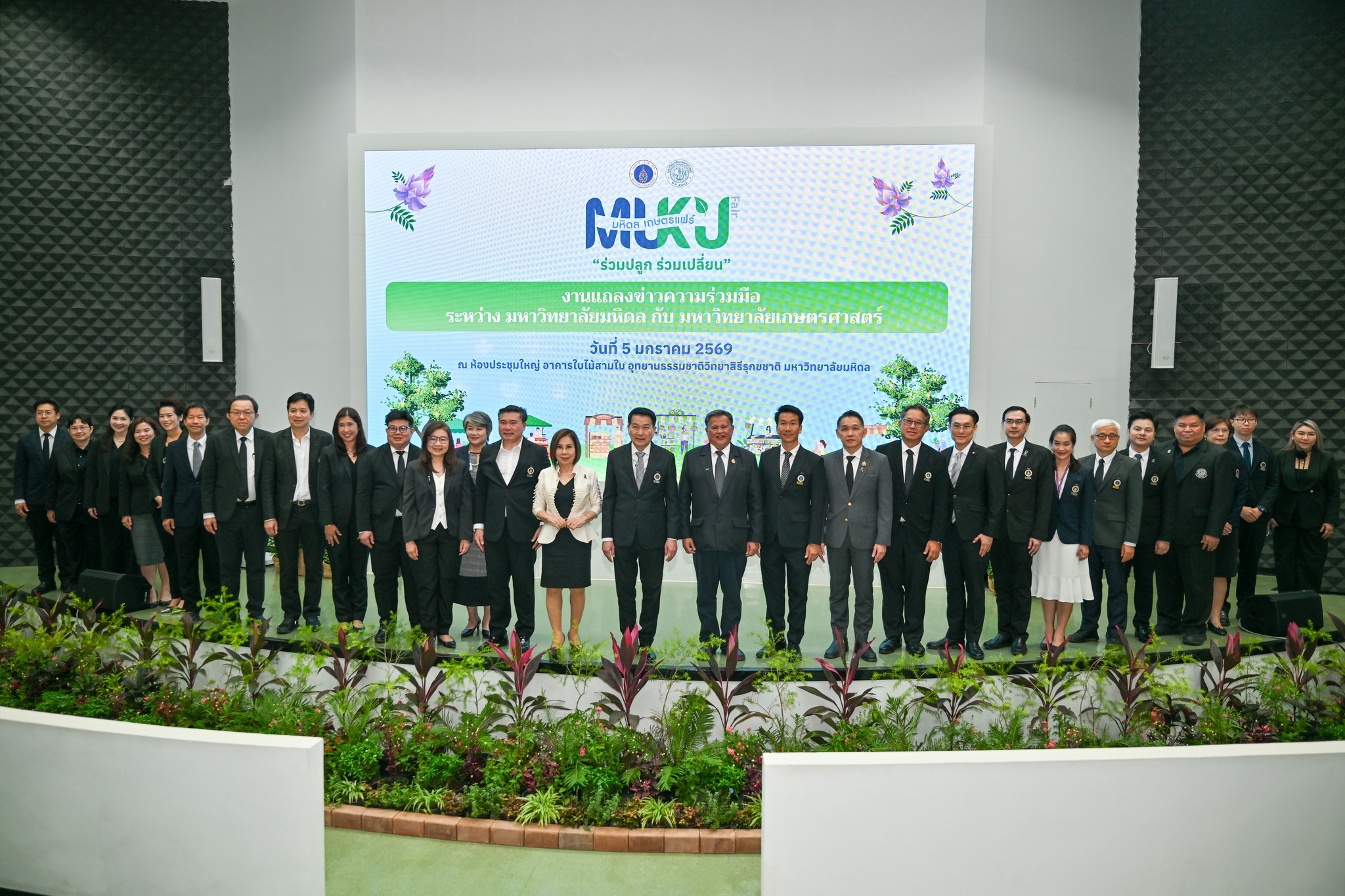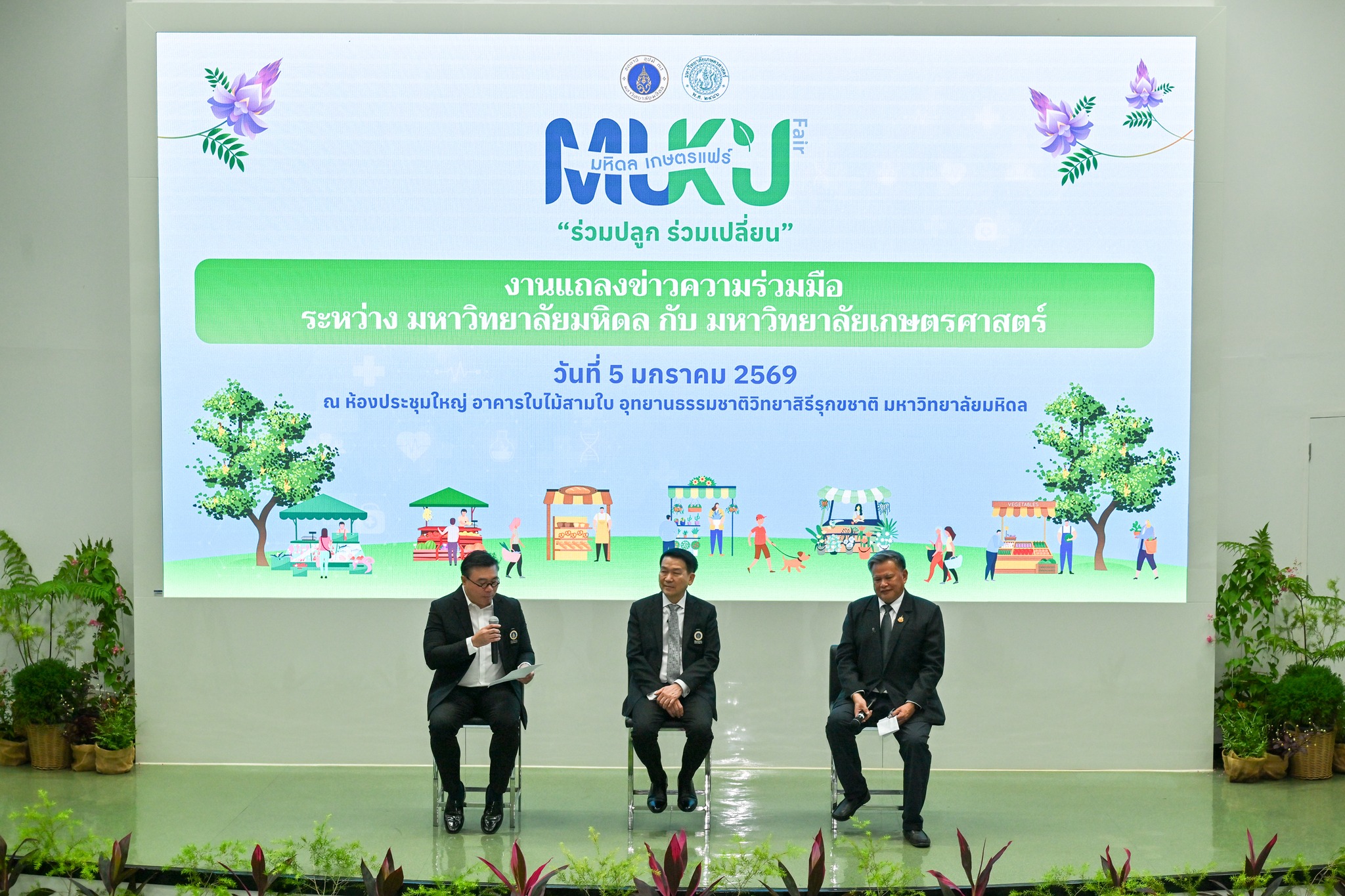 ศาสตราจารย์ นายแพทย์ปิยะมิตร ศรีธรา อธิการบดีมหาวิทยาลัยมหิดล พร้อมด้วย ดร.ดำรงค์ ศรีพระราม รักษาการแทนอธิการบดีมหาวิทยาลัยเกษตรศาสตร์ และรองศาสตราจารย์ ดร.สิทธิวิชญ์ เลิศศิริ รองอธิการบดีมหาวิทยาลัยมหิดล ประธานคณะทำงานจัดงาน ร่วมแถลงข่าวความร่วมมือระหว่าง มหาวิทยาลัยมหิดล และ มหาวิทยาลัยเกษตรศาสตร์ ในการจัดงาน “มหิดล – เกษตรแฟร์ 2569” (MU x KU Fair 2026) ภายใต้แนวคิด “ร่วมปลูก ร่วมเปลี่ยน” (Grow Together, Change Together) เมื่อวันที่ 5 มกราคม 2569 ณ ห้องประชุมใหญ่ อาคารใบไม้สามใบ อุทยานธรรมชาติวิทยาสิรีรุกขชาติ มหาวิทยาลัยมหิดล