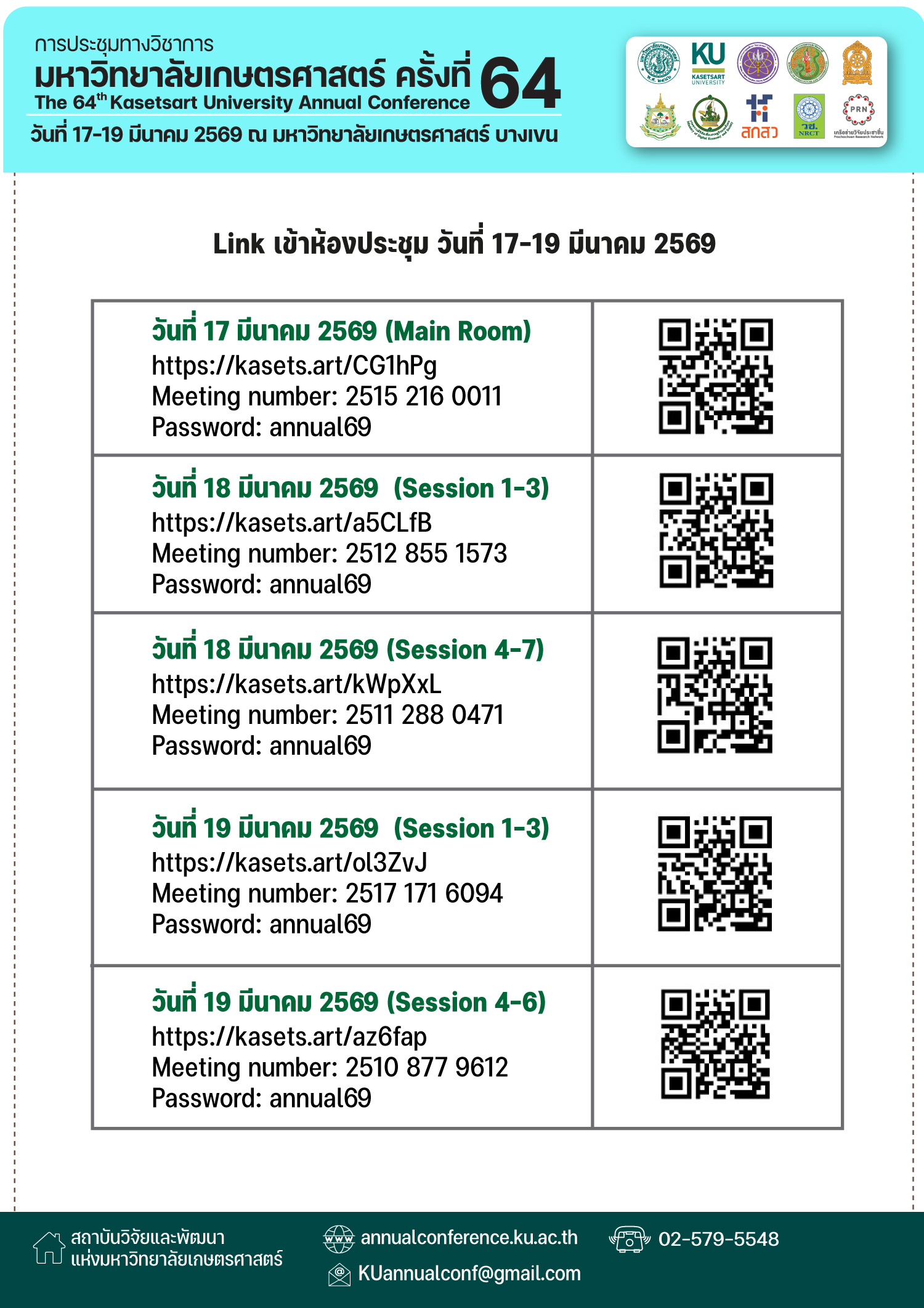 ผู้สนใจสามารถลงทะเบียนเข้าร่วมงานโดยสแกนคิวอาร์โคดที่ปรากฏในโปสเตอร์ประชาสัมพันธ์ และสามารถรับชมการถ่ายทอดสดแบบออนไลน์ผ่านระบบ Webex Meeting (Meeting Number: 2517 171 6094, Password: annual69 (Session 1)) หรือสแกนคิวอาร์โคดเพื่อเข้าสู่ระบบการประชุมได้โดยตรง ทั้งนี้ สามารถสอบถามรายละเอียดเพิ่มเติมได้ที่ ฝ่ายวิจัยและบริการวิชาการทางสังคมศาสตร์ คณะสังคมศาสตร์ มหาวิทยาลัยเกษตรศาสตร์ โทรศัพท์ 0-2561-3480 ภายใน 1562 ต่อ 222